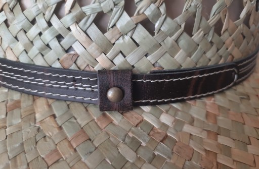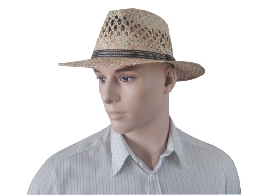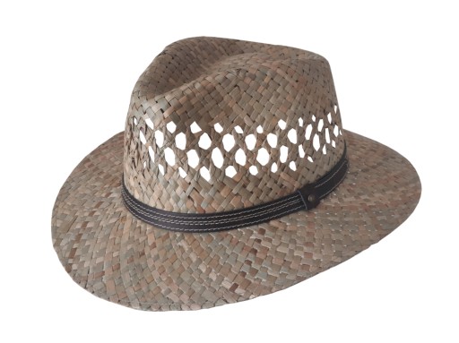 Stylowy, słomkowy kapelusz męski / damski. Ozdobiony skórzanym ciemnobrązowym paskiem. Dostępny w kolorze zielono beżowej słomki. Wykonany w 100% z naturalnego surowca słomki. Kapelusz jest bez podszewki z materiałowym potnikiem. Na główce posiada ażurową część, która polepsza cyrkulację powietrza, dzięki temu głowa się nie poci. Idealny na wakacyjny wyjazd. Rondo kapelusza jest sztywne i nieznacznie skierowane do dołu. Jego szerokość wynosi ok 7 cm. Wysokość kapelusza ok. 13 cm.