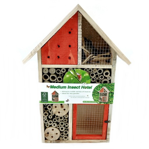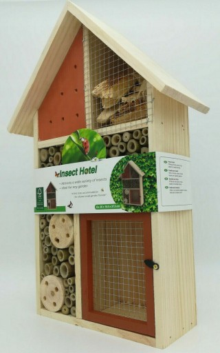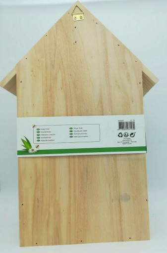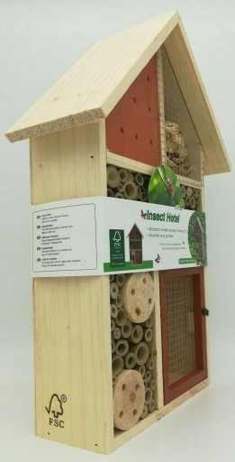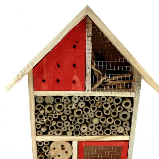 - wykonany z drewna oraz naturalnych materiałów takich jak trociny czy zdrewniałe trawy(rurki), szyszki, które są nieszkodliwe dla owadów