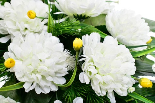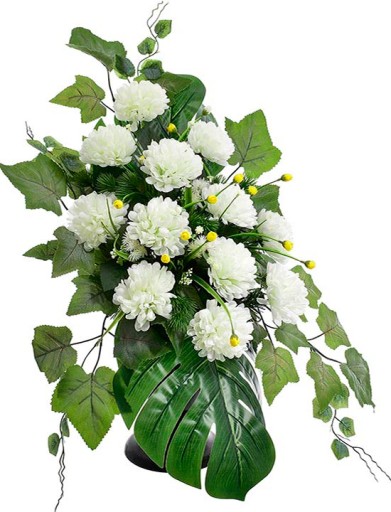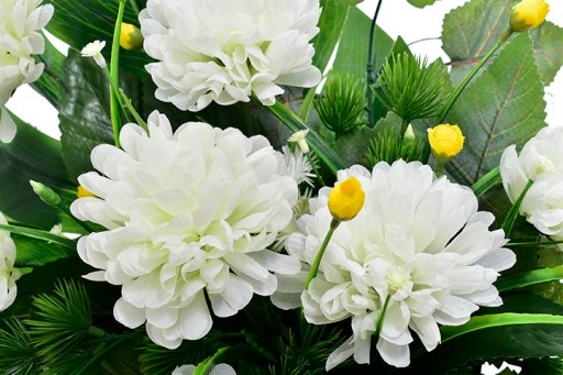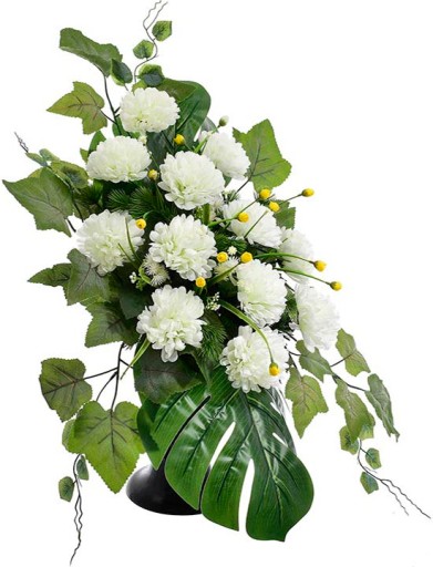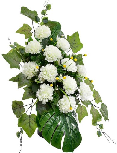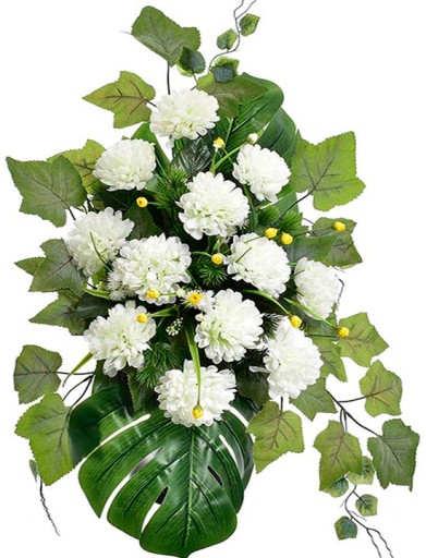 ✅ Dekoracja składa się z cudownych kwiatów chryzantemy oraz licznych zielonych dodatków.