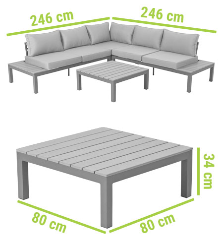 Dużym atutem tego zestawu ogrodowego jest kwadratowy stolik o wymiarach: 80 x 80 x 34 cm. Ma nowoczesny i minimalistyczny wygląd oraz stabilną konstrukcję, świetnie się komponuje z wygodną narożną kanapą.