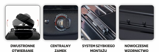 Kufer zaprojektowany został tak, aby zapewnić maksymalny komfort użytkowania: opływowy kształt pozwala na uzyskanie dużej pojemności bez nadmiernego zwiększania oporów powietrza, a nowoczesny sprężynowy system zapewnia płynne otwieranie boksu z możliwością zatrzymania pokrywy w pozycji otwartej. Box otwierany jest dwustronnie, co umożliwia dostęp do jego zawartości z prawej oraz lewej strony samochodu.