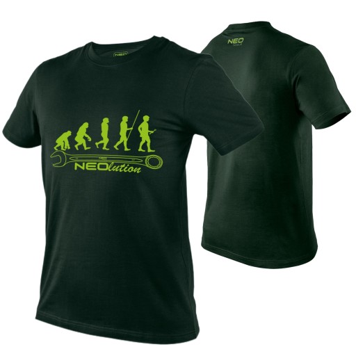 T-shirt z nadrukiem, NEOlution, rozmiar XXXL 81-640-XXXL marki NEO to t-shirt roboczy z grafiką NEOlution w kolorze butelkowej zieleni. Neonowo-zielony nadruk na przodzie przedstawia uproszczony rysunek ewolucji – człowieka od australopiteka do tego używającego narzędzi NEO (m.in. klucza płasko oczkowego). Posiada krótki rękaw oraz okrągły dekolt z elastyczną wypustką. Wyprodukowany z miękkiej dzianiny bawełnianej (100%) o gramaturze 180 g/m2. Unikalny projekt własny marki, a także drukowane na karku logo i imienna wszywka sprawiają, że to idealny t-shirt niemal na każdą okazję – do pracy oraz do chodzenia na co dzień. Odzież marki NEO posiada certyfikat CE.