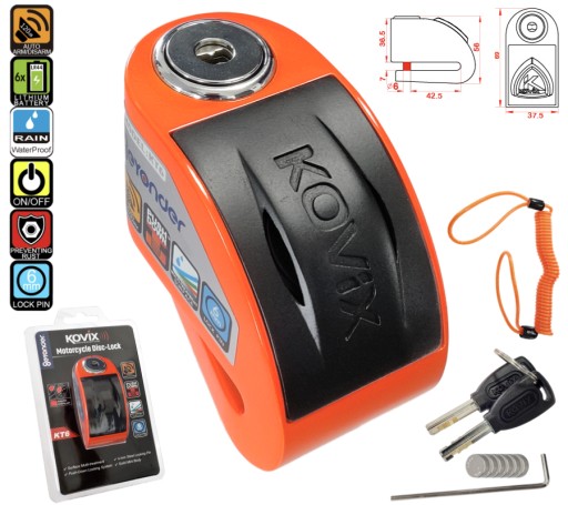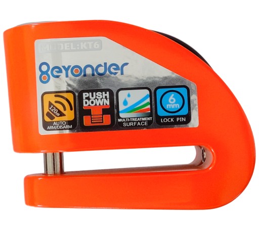 Blokada tarczy hamulcowej z wbudowanych alarmem o natężeniu dźwięku 120 dB z możliwością ustawiania opcji syreny ON/OFF. Zamek ze stali nierdzewnej i wodoodporne podzespoły elektryczne gwarantują ochronę przed korozją i niezawodność w każdych warunkach atmosferycznych. Blokada wyposażona jest w długo pracującą i przyjazną dla środowiska litową baterię. Zabezpieczenie blokuje koło bolcem o średnicy 6 mm, przez co uniemożliwia jazdę i ruch motocykla lub skutera.
