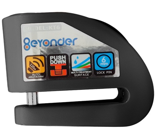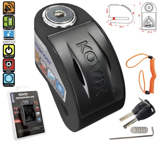 Blokada tarczy hamulcowej z wbudowanych alarmem o natężeniu dźwięku 120 dB z możliwością ustawiania opcji syreny ON/OFF. Zamek ze stali nierdzewnej i wodoodporne podzespoły elektryczne gwarantują ochronę przed korozją i niezawodność w każdych warunkach atmosferycznych. Blokada wyposażona jest w długo pracującą i przyjazną dla środowiska litową baterię. Zabezpieczenie blokuje koło bolcem o średnicy 6 mm, przez co uniemożliwia jazdę i ruch motocykla lub skutera.