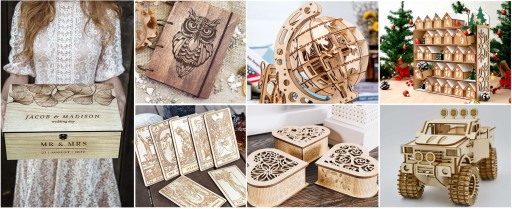 Przedmioty do cięcia: karton, włóknina, deska drewniana, akryl, cienka plastikowa deska