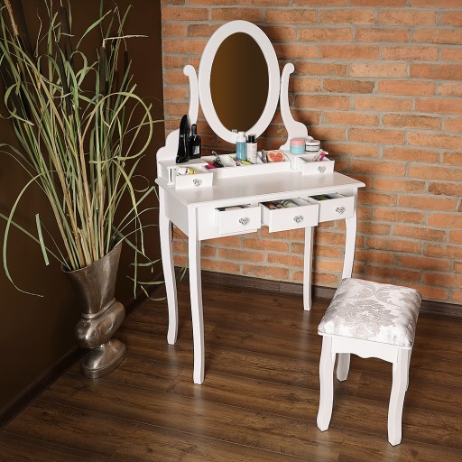 Niepowtarzalna toaletka kosmetyczna ze stołkiem i z dużym lustrem.Toaletka jest ręcznie wykonana, stołek zrobiony jest w wiktoriańskim stylu.Toaletka posiada zaokrąglone nogi i unikalne zdobienia wykonane z niebywałą precyzją.Pięć szuflad pomieści bardzo dużą ilość art. kosmteycznych.