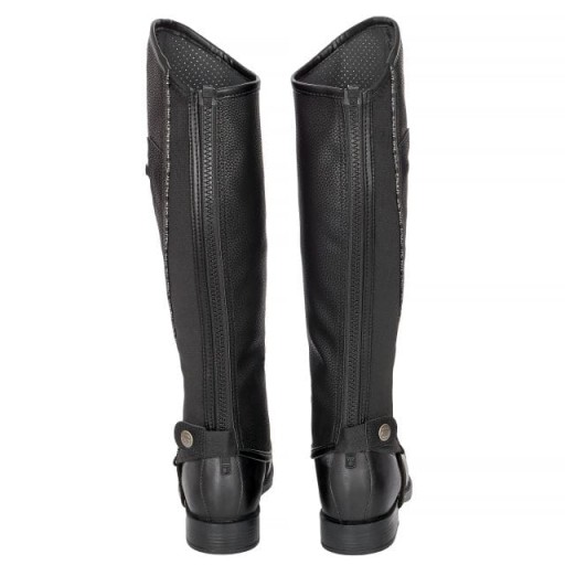 Eleganckie czapsy wykonane z dobrej jakości poliestrowego materiału. Szycia wykonane są w taki sposób, aby czapsy dobrze się dopasowały i ładnie prezentowały na łydce. Posiadają solidny zamek z tyłu, zapinany od góry do dołu, obok którego znajduje się rozciągliwy materiał, dzięki czemu czapsy są bardziej elastyczne i łatwiej się zakładają. Zatrzask zaczepiony na sprężystym materiale stanowi zabezpieczenie przed rozsunięciem się zamka. Od wewnątrz podszyte są zamszowym materiałem, dzięki czemu mają dobrą przyczepność do spodni i nie przesuwają się. Poniżej kolana, materiał jest perforowany, co zwiększa jego przepuszczalność powietrza. Naszyte małe zdobienie w postaci srebrnego wędzidła sprawia, że czapsy stają się wyjątkowe i przykuwają uwagę.