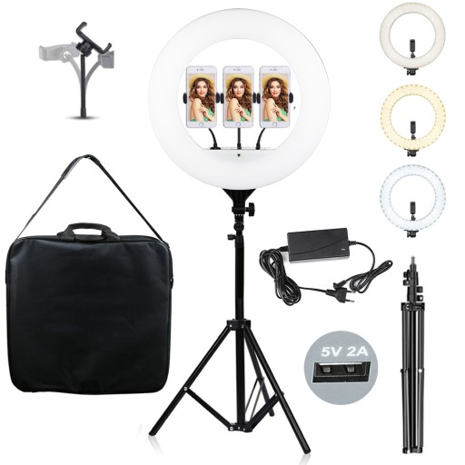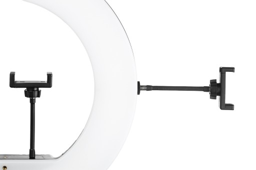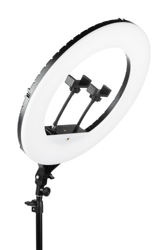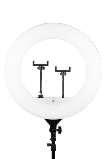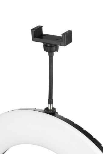 - Lampa pierścieniowa LED emitująca szeroki wachlarz bieli w zakresie 3000K - 6500K z możliwością zamontowania uchwytu na telefon w aż 7 miejscach!