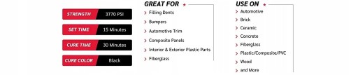PlasticBonder łączy różne powierzchnie, takie jak metal, kompozyty, włókno szklane i inne. Twardnieje w ciągu 15 minut w temperaturze pokojowej i jest w pełni utwardzony w ciągu 1 godziny.