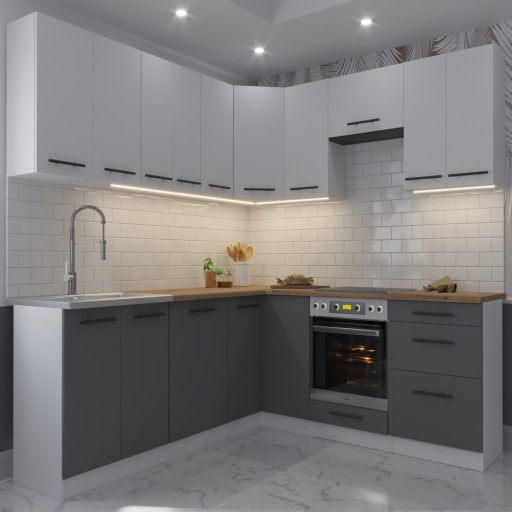 - Fronty kuchni wykonane są z płyty laminowanej grubości 16 mm w kolorze szarym oraz białym