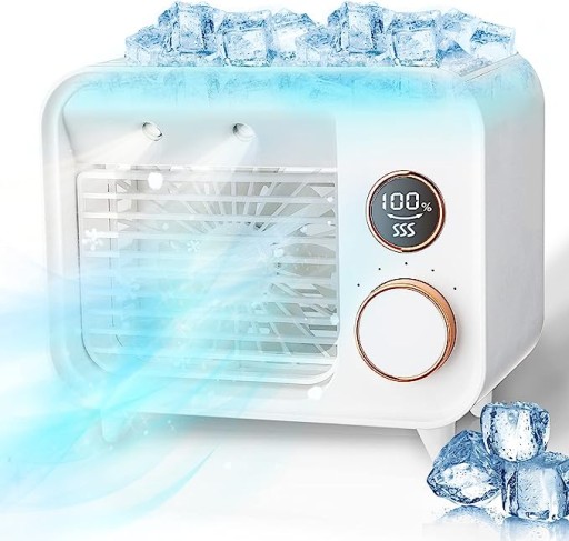 - Wielofunkcyjny mini klimatyzator : Mini wentylator klimatyzatora, nawilżacz, wentylator chłodnicy, dyfuzor zapachowy, lampka nocna, kombinacja pięć w jednym, wielofunkcyjna konstrukcja, pozwala trzymać się z dala od gorącego lata i cieszyć się orzeźwiające lato. Możesz użyć go jako zwykłego małego wentylatora, dodać wody lub lodu, aby uzyskać chłodniejszy zimny wiatr. Emitowana mgiełka nie tylko zwiększa wilgotność powietrza, ale także utrzymuje nawilżenie skóry.