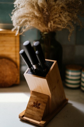 Zaprezentuj Klasę i Innowację w Twojej Kuchni z Bambusowym Stojakiem na Noże Veliatte® z Ostrzałką na Magnes.