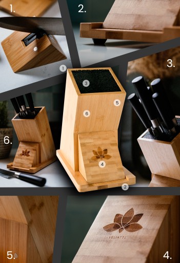 Odkryj połączenie funkcjonalności z eleganckim designem dzięki naszemu bambusowemu stojakowi na noże Veliatte®. Ten niezwykle stylowy dodatek do Twojej kuchni nie tylko pięknie eksponuje Twoje noże, ale również oferuje im bezpieczne i higieniczne miejsce do przechowywania.