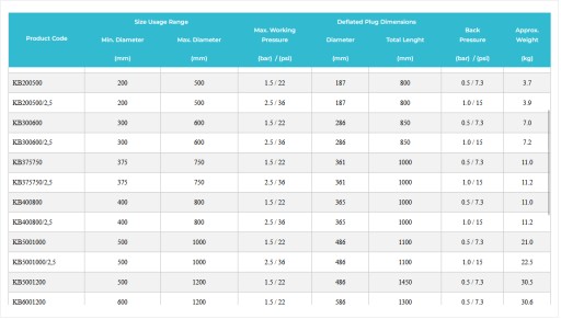 Korki do rur firmy TAPASAN służą do czasowego blokowania rurociągów. SBR+NR jest wytwarzany przez wulkanizację gumy i tkanin o wysokiej wytrzymałości. Jest odporny na temperatury od -30°C do +70°C. Dzięki szerokiemu zakresowi średnic umożliwia blokowanie wielu zakresów średnic rur za pomocą jednego produktu. W ofercie posiadamy korki pneumatyczne od średnicy rury 25mm do średnicy 2800mm. Najważniejszą zaletą jest to, że nasze produkty mogą pracować przy bardzo niskich ciśnieniach i osiągają wysokie wartości siły tarcia przy ciśnieniu roboczym.