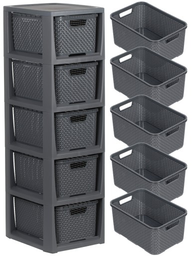 Produkt składa się z 5 pojemników, które pełnią funkcję szuflad. Zostały wykonane z tworzywa sztucznego, ale swoim wyglądem przypominają rattanowe kosze. Dzięki temu prezentują się bardzo estetycznie.