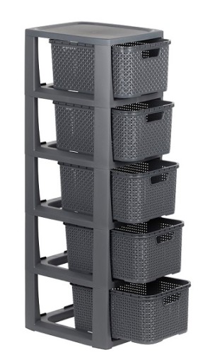 Produkt składa się z 5 pojemników, które pełnią funkcję szuflad. Zostały wykonane z tworzywa sztucznego, ale swoim wyglądem przypominają rattanowe kosze. Dzięki temu prezentują się bardzo estetycznie.