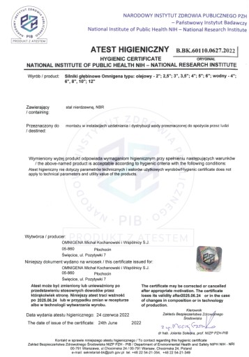 Pompa głębinowa o średnicy 75mm, o budowie odśrodkowej, przeznaczona do tłoczenia czystej, zimnej, słodkiej wody z odwiertów głębinowych.