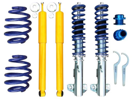W skład zestawu wchodzą 2 amortyzatory gwintowane, 4 sprężyny sportowe, amortyzatory tylne, tuleje regulacyjne tylne, klucz do regulacji wysokości oraz certyfikat TUV
