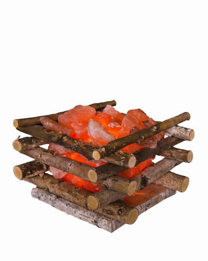 Lampa solna ognisko to małe naturalne kryształki solne w pomarańczowym kolorze ułożone w konstrukcji z surowych brzozowych gałązek na kształt ogniska.