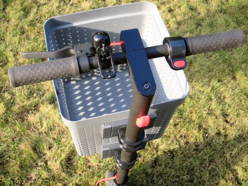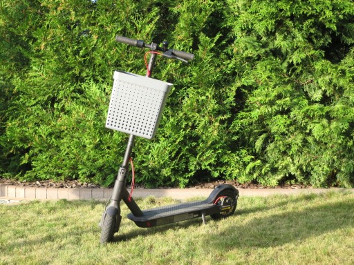 (Zdjęcia przedstawiają kosz zamontowany na przykładowej hulajnodze innej marki. Sprzedawany produkt jest dostarczany z kompletem obejm dostosowanych do hulajnogi podanej w opisie oferty)