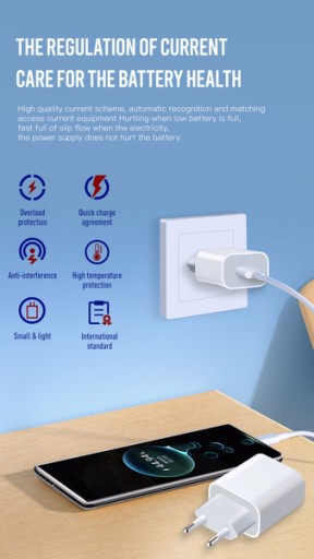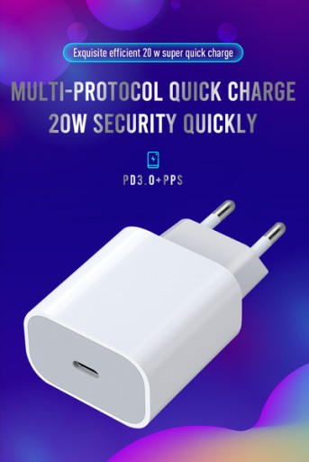 Mała, lekka i poręczna ładowarka typu C z funkcją szybkiego ładowania do iPhonów, smartfonów z systemem Android, iPadów, robotów sprzątających i innych kompatybilnych urządzeń. Ładowarka o mocy 20W automatycznie dopasowuje odpowiednie napięcie do konkretnego sprzętu oraz do aktualnego poziomu jego naładowania.