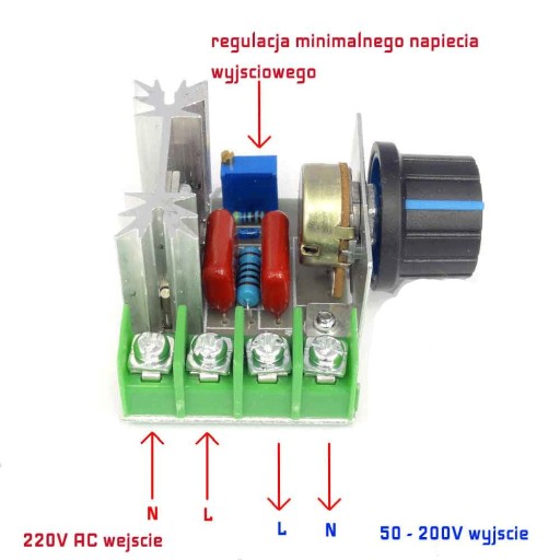 Napięcie na wyjściu może być regulowane w zakresie 50V do 230V. Należy pamiętać, że ze względu na pracę z napięciem 230V należy zachować szczególną ostrożność. Schemat podłączenia modułu znajduje się w galerii produktu, strzałki na zdjęciu pokazują gdzie wpinamy napięcie wejściowe a gdzie nasz regulator napięcia ma wyjście napięcia regulowanego potencjometrem.