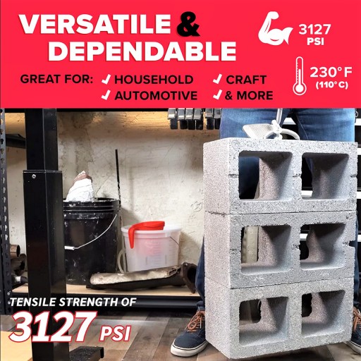 Kwik Weld jest wzmocniony stalą, ma wytrzymałość na rozciąganie 3127 PSI i może wytrzymać temperatury do 148°C. Po całkowitym utwardzeniu Kwik Weld jest wodoodporny i odporny na ropę, chemikalia i kwasy.