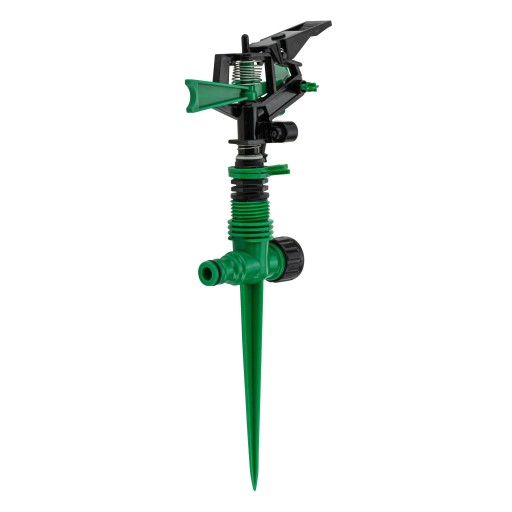Zraszacz ogrodowy pulsacyjny z ręczną regulacją sektora działa w postaci odbojników, która umożliwia modyfikację kąta obrotu zraszacza od 30° do 360°. Montowany za pomocą długiego i solidnego szpikulca wbijanego w ziemię. Dodatkowo zraszacz posiada regulowany daszek umożliwiający łatwe ograniczenie zasięgu zraszania poprzez jego podnoszenie i opuszczanie. Niezastąpiony podczas letnich upałów i susz, aby równomiernie nawadniać trawniki, rabaty kwiatowe, niskie krzewy, drzewka, itp. Wykonany z wysokiej jakości tworzywa sztucznego, odpornego na szkodliwe warunki atmosferyczne, dzięki temu zapewnia bezproblemową pracę na kilka sezonów.