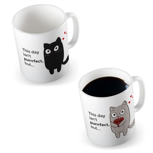 Zaskakujący Kubeczek - Kotek przedstawia niewinnego i uroczego kociaka, który - tak jak człowiek - potrzebuje trochę ciepła, by pokazać innym swoje prawdziwe oblicze. Wystarczy zalać kubeczek gorącą wodą, by naszym oczom ukazała się ukryta czarująca wiadomość, która zmiękczy każde serducho. This day isn't purrrfect, but… you are - co po polsku oznacza: Ten dzień nie jest idealny, ale… Ty jesteś.