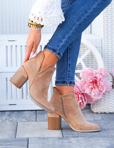 Eleganckie beżowe botki damskie. Buty w całości wykonane z mięciutkiej eco skóry zamszowej. Stabilny, szeroki obcas słupek zapewni komfort użytkowania. Niebanalny look obuwiu nadaje wycięcie na kostce. Cholewka wzdłuż krawędzi posiada subtelny ażurowy print.
