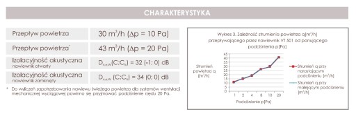 Ilość dostarczanego powietrza zależy od różnicy ciśnienia na zewnątrz i wewnątrz pomieszczenia. Dzieje się tak do poziomu różnicy ciśnień, przy którym wydajność nawiewnika osiąga wartość maksymalną. Nawiewnik ciśnieniowy manualny ma możliwość ręcznego otwarcia i zamknięcia.
