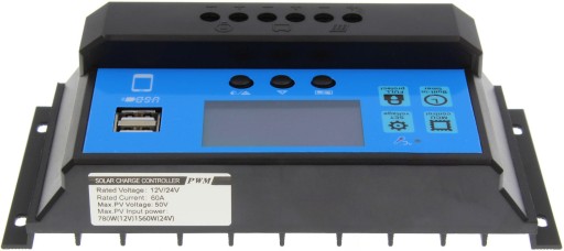 Regulator solarny i kontroler ładowania do paneli fotowoltaicznych 12/24V z wyświetlaczem LCD i portami USB. Regulator przetwarza energię dostarczaną z paneli do akumulatora, jednocześnie zabezpiecza przed przeładowaniem akumulatorów oraz nadmiernym rozładowaniem przez odbiorniki podłączone do regulatora. Maksymalne napięcie podłączanych paneli fotowoltaicznych nie może przekraczać 50V. Urządzenie wyposażone w duży, aluminiowy radiator chłodzący układ MOSFET. Regulator znajduje zastosowanie w lampach solarnych, kamperach, na łodziach.