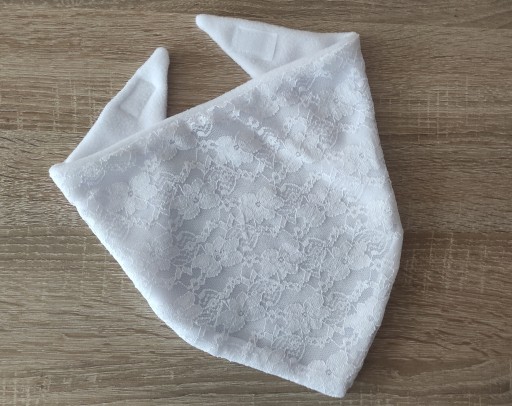 Chustka trójkątna, uszyta z 1 warstwy koronki i 1 warstwy polaru, zapinana na rzep.