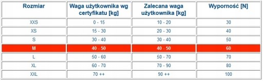Kamizelkę należy przy zakupie dobierać zawsze do wagi użytkownika. Jej nowoczesna konstrukcja i bardzo duży zakres regulacji obwodu w pasie powoduje, że będzie doskonale pasowała na wszystkie osoby o danej wadze. Kamizelka w rozmiarze M jest zalecana do użytkowania dla osób o wadze ciała od 40-50 kg.