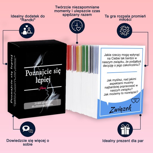 Gra jest stworzona po to, aby wywołać pasjonujące, ciekawe i głębokie rozmowy, które będą trwały wiele godzin. Zachęca do mówienia prawdy otwarcie i dzielenia się planami na przyszłość. Z tym pakietem wzmocnicie swój związek, jednocześnie dowiadując się o sobie dużo więcej, na głębszym poziomie. To pewne, że chcesz lepiej poznać swoją połówkę, ale czasami nie wiesz jak lub nie wiesz, jakie pytania zadać, a może nie jest to odpowiedni moment lub w przeszłości przegapiłeś do tego okazję. Ta gra pozwala zrobić to wszystko łatwiej niż kiedykolwiek, na poziomie emocjonalnym i intymnym, poprzez sposoby, których nigdy sobie nie wyobrażałeś. To przewodnik do zdrowszego i szczęśliwszego związku.