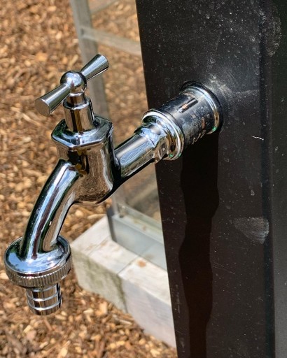 Na tylnej ściance słupka, na wysokości 50 cm zamocowany jest rozdzielacz 1/2 (uzyskujemy 2 dodatkowe wyjścia umożliwiające na przykład podłączenie sterownika automatycznego podlewania, węży ogrodowych lub linii kroplujących bez konieczności ciągłego przepinania złączki na kranie).