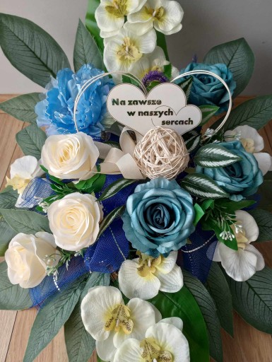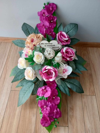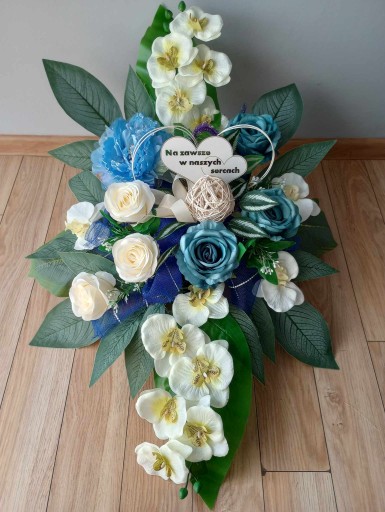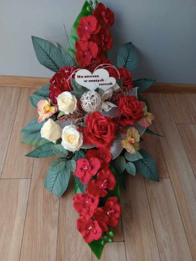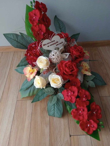 Kompozycja sztuczna (tzw. stroik, ikebana) Z SERCEM NA ZAWSZE W NASZEJ PAMIĘCI jest wykonana z sztucznej choiny zabetonowanej w doniczce plastikowej co daje jej stabilność. Zabetonowanie daje jej odpowiedni ciężar, co uniemożliwia suwaniu się kompozycji grobu. Kompozycja ma ok. 80 cm długości i 50 cm szerokości.