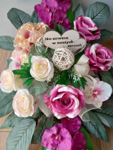 Przepiękny komplet na grób ze sztucznych kwiatów, kompozycja na płytę z możliwością wybrania dedykacji dla babci/dziadka/mamy/taty (wszystkie dostępne opcje są widoczne na ostatnim zdjęciu) oraz bukiet do wazonu na flakonie uniwersalnym. Nasze kompozycje wykonujemy własnoręcznie ze starannością, dzięki czemu stroiki są niepowtarzalne, a na żywo prezentują się jeszcze piękniej :)