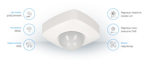 Czujnik służy do automatycznego sterowania oświetleniem lub innymi urządzeniami elektrycznymi. Potrójny system sensorów z detektorami umieszczonymi pod specjalnym kątem zapewnia kontrolę całego obszaru. Urządzenie nadaje się do zastosowania w dużych pomieszczeniach np. hale magazynowe, poczekalnie. Czujnik charakteryzuje wyższa inteligencja i większa dokładność, która umożliwia wykrywanie nawet najmniejszych ruchów. Potencjometry do regulacji: czasu świecenia i czułości natężenia światła. Czujnik współpracuje z oświetleniem LED-owym.