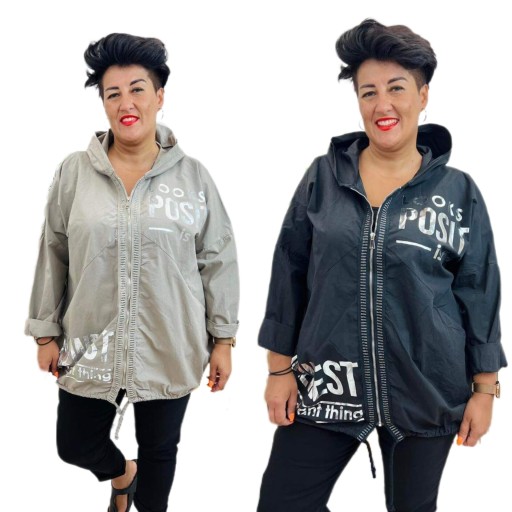 Kurtka na dole posiada ściągacz ze sznurkiem, po bokach kieszonki, ozdobiona srebrnymi napisami, można nosić również jako bluza oversize.