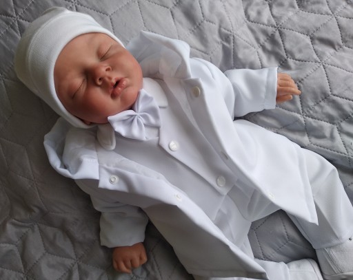 Śliczny biały komplecik na 68 cm: kurteczka, spodenki, kamizelka, koszulobody, mucha i czapeczka.