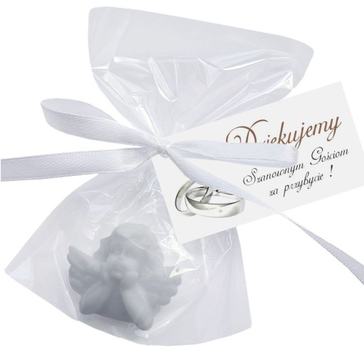 W skład zestawu wchodzą: aniołek z mocnego tworzywa + woreczek foliowy + karteczka nadrukiem podziękowania + wstążka do przewiązania kokardki.
