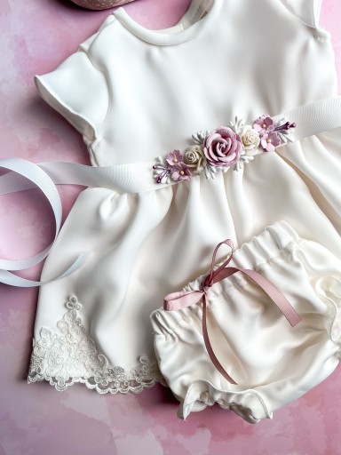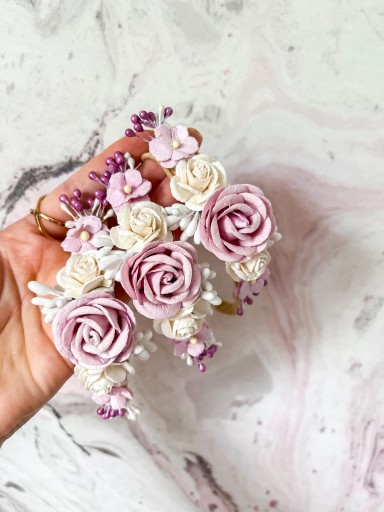 Ręcznie wykonany zestaw opaska oraz pasek ozdobiona delikatnymi kwiatami w kolorze śmietankowymi i liliowym. Idealny dodatek do stylizacji na Chrzest, wesele czy do sesji zdjęciowej.