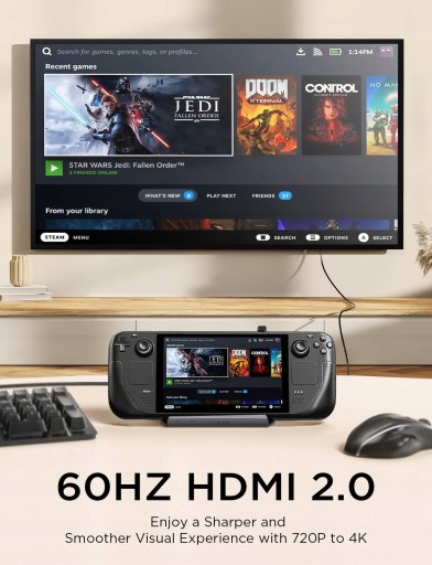 ? Wyjście HDMI 2.0 4K przy 60 Hz: stacja dokująca Stream Deck ma wyjście HDMI 2.0, które obsługuje rozdzielczość 4K przy 60 Hz. Podłączając zewnętrzny monitor 4K, możesz cieszyć się ostrzejszymi i płynniejszymi wrażeniami wizualnymi, zanurzając się w swoich ulubionych grach. Aby uzyskać wyższą rozdzielczość, po prostu przejdź do Ustawienia gry > Właściwości > Ogólne > Rozdzielczość gry. Należy jednak upewnić się, że zarówno porty HDMI, jak i kable są zgodne ze standardem HDMI 2.0 lub nowszym