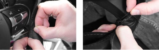 3. Obszywamy kierownicę, przeplatając nitkę przez co drugi ścieg, wykonując ruchy w kształcie litery S. Należy pamiętać, że zahaczamy tylko o nitkę, nie dziurawiąc skóry.