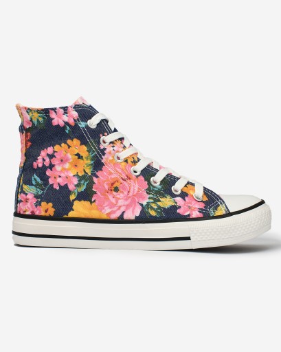 Wysokie damskie trampki wykonane z materiału tkaninowego na gumowej podeszwie. Sznurowane, zapewniają idealne dopasowanie. Zdobione printem w kwiaty, dodają uroku i letniego charakteru. Doskonałe do codziennych stylizacji!