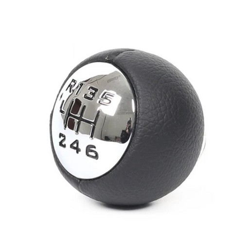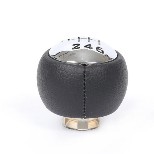 Czarna skórzana gałka zmiany biegów z nakładką w kolorze chrom i czarnym schematem 6 biegów + R