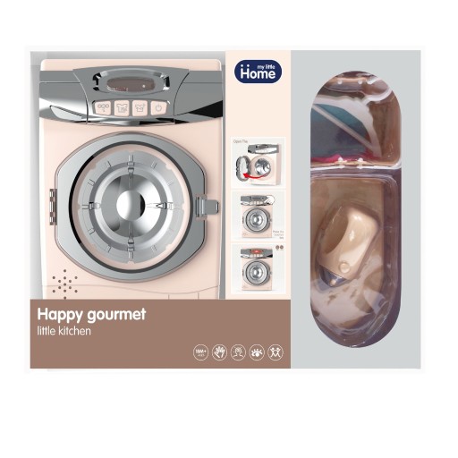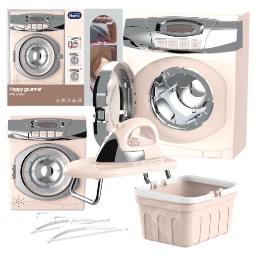 Zabawki w naszym zestawie są funkcjonalne i przypominają te z życia codziennego. Pralka posiada otwierane drzwiczki, obracający się bęben, wydaje dźwięki, a także świecą diody sygnalizujące jej pracę.