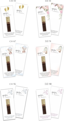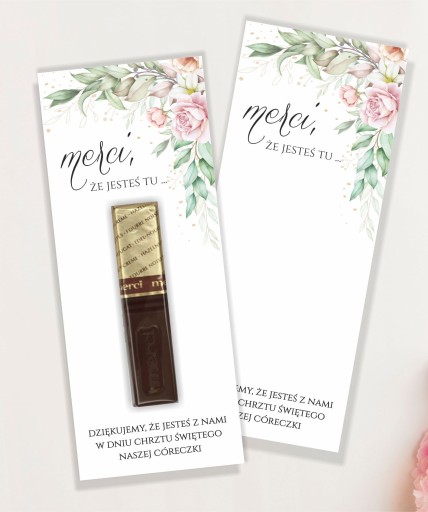 Karteczki na czekoladki Merci z uroczą, delikatną grafiką idealnie sprawdzą się jako podziękowanie dla gości na chrzest, urodziny bądź komunię waszego dziecka.