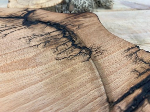 Podstawka pod naczynie wykonana z drewna olchowego. Drewno jest wypalane prądem, który tworzy wyjątkowe wzory, następnie opalane oraz impregnowane olejem lnianym. Deska posiada wydrążenie na naczynie w kształcie ryby.